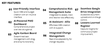 Allie, the AI assistant, simplifies WBS creation and seamless Google Drive integration enhances document accessibility. The Lessons Learned Register captures insights for continuous improvement, making PMaspire's Baseline PMO a hub of efficiency and innovation.